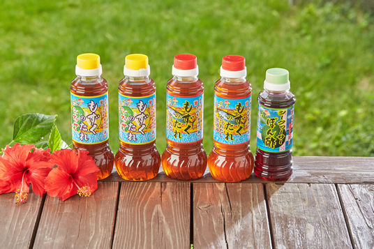 賞味期限(製造日から):約5ヶ月 内容:5本セット(シークヮーサー1本、かつおだし仕込み1本、ゆず1本、にんにく1本、ポン酢1本)